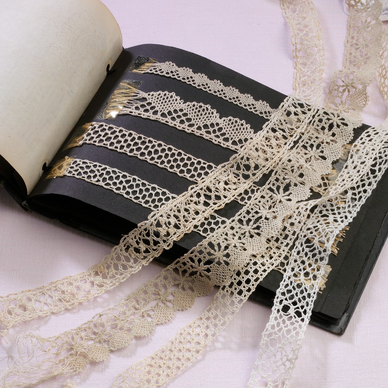Jane’s bobbin lace samples are mounted in a twenty-page black photograph album. Scotch-taped or glued to the pages are six small prickings; three typed pages of instructions, one with hand-drawn illustrations of bobbin configurations; and twenty-nine lace samples. The four pieces of bobbin lace that were in the bag range in length from 16½ inches (41.9 cm) to 29 inches (73.7 cm) and in width from about 1 inch (2 cm) to 1⅜ inches (3 cm).