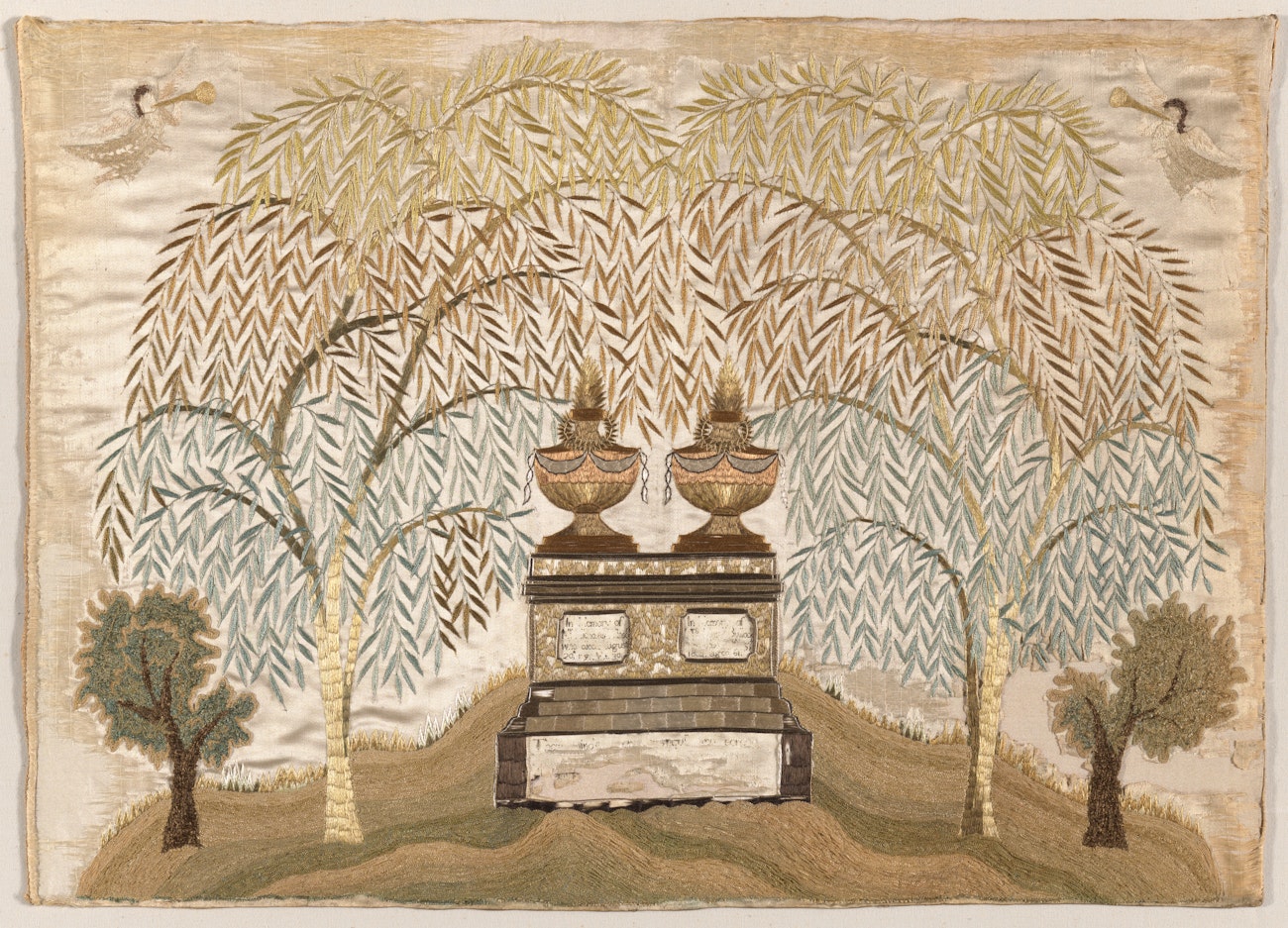 Mourning Sampler, about 1810. Made at Mary Blach’s School, Providence. Silk, satin weave; embroidered with silk, silk chenille, and human hair. 42.2 × 58.8 cm (16 1/2 × 23 1/8 in.)