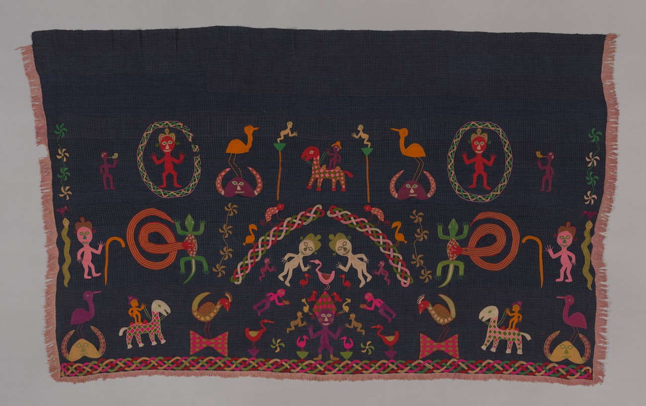 Ogboni Chief’s Wrapper, early to mid-20th century. Iwo Yoruba; Nigeria. Cotton, indigo dyed; sixteen strips of plain weave; embroidered with wool; edged with cotton fringe