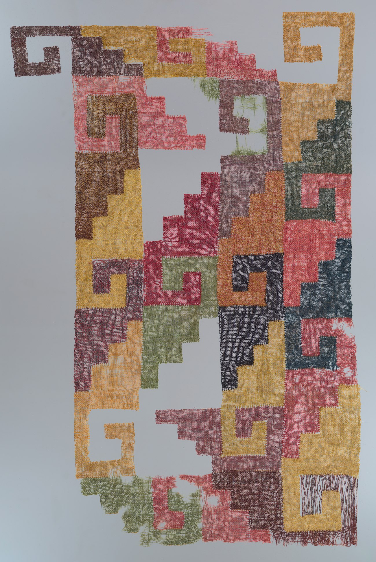 Nasca; south coast, Peru. Camelid wool and cotton, plain weave of discontinuous single interlocking warp and weft, scaffold weave (espiral escalonada, 'stepped-fret' motif)