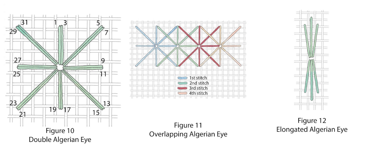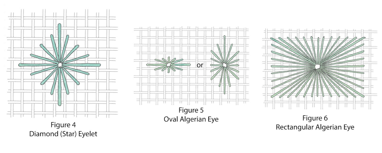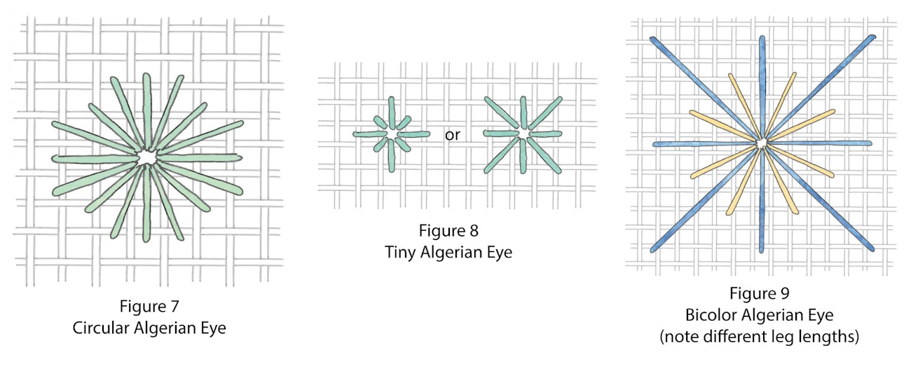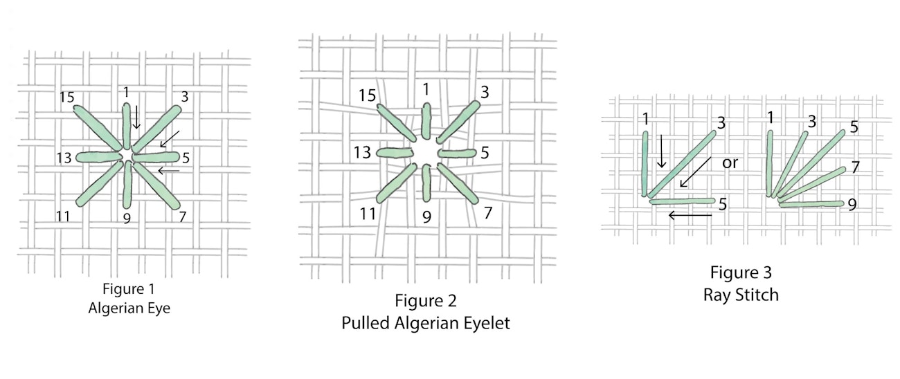 The multi-shaped Algerian eye stitch (Figure 1) is a popular, non-pulled, counted thread or canvas stitch, and the Algerian eyelet stitch (Figure 2) is the regular eye stitch with the legs pulled to create a distinctive center hole. London’s Victoria and Albert Museum has numerous examples of embroideries that include this stitch, which are labeled “Algerian XVI century.” This is possibly the source of the name.
