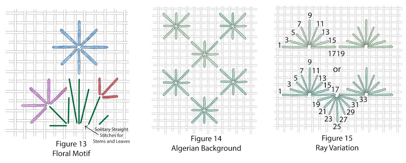 The Algerian eye and eyelet stitches have a long European history, appearing on some of the earliest samplers and clothing. The Italians worked an overlapped version (Figure 11) of this stitch for backgrounds. It appeared on the Anne Gower sampler (1610), one of America's oldest samplers, as lettering, a time-consuming endeavor as there are eight or more legs per stitch. The “A” in the stitched sampler has 112 legs! This stitch is also known as the star eyelet, square eyelet, star, and distelfink stitch. It’s difficult to draw a line of distinction among the numerous shape variations of the Algerian eye and separately named stitch entities, such as the ray or fan stitches (Figures 3 and 15), which are only partial stitches of the whole stitch. Should they be considered a separate stitch with a different name or simply an Algerian eye or eyelet variation? My take on this is, if the stitch variation is well known and has a long history and/or a more appropriate name, just accept it but realize that the stitch ultimately belongs to the larger Algerian eye stitch group. Do not confuse this stitch with the Algerian filling, Algerian plaited, or the Algerian border stitches.