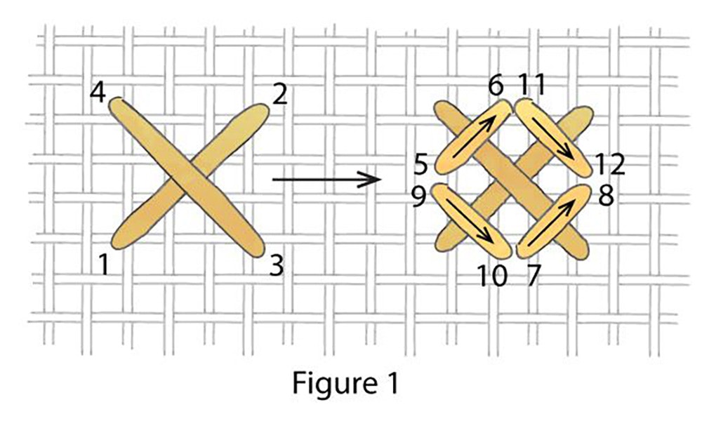 The distinctively textured rice stitch is a member of the very large cross-stitch family, and it has numerous variations. Historically, this easy decorative stitch has been known as the cross corners cross stitch, boss, squared boss, or William and Mary stitch. Also, the name rice stitch refers to a specific stitch in knitting.
