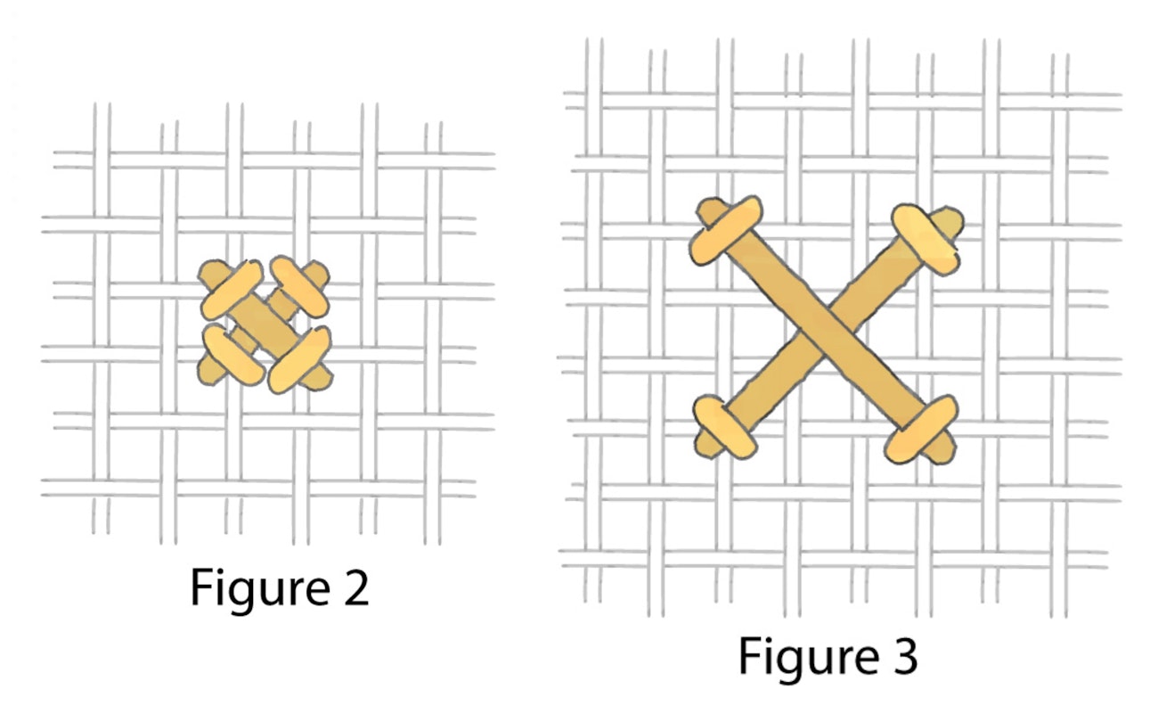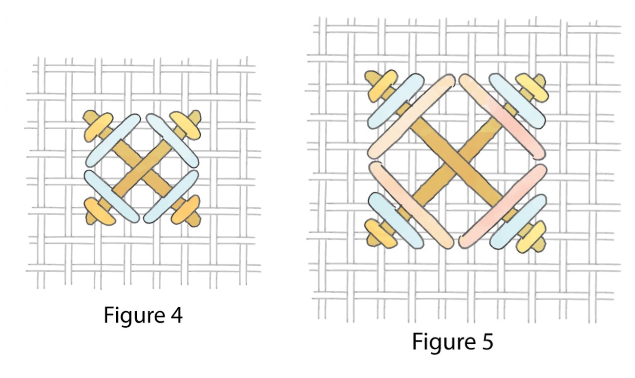 The rice stitch is composed of a basic square or rectangular cross stitch (Figures 1–7) or an upright cross stitch (Figures 8 and 9) of almost any size as the base component with smaller (usually), diagonal, tack-down stitches of varying lengths over the four cross-stitch legs for the top layer. These smaller stitches generally create a backstitched square centered over the cross stitch (Figures 1, 2, 4, 5, 8, and 9). There may be one to several of these tack-down stitches per leg. The doubled rice stitch appellation signifies that there are two tack-down stitches per leg (Figures 4, 7, and 9) and for the triple rice stitch, three tack-down stitches per leg (Figure 5).