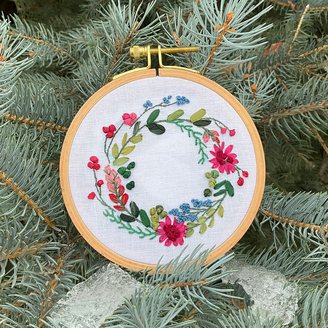 I love the way that silk ribbon adds dimension to even the simplest design, and I selected shades of overdyed ribbon to bring even more richness to the leaves and buds in this winter wreath ornament. Silk ribbon has been used for needlework in Europe and Asia for centuries: in the United States, the Moravians in Pennsylvania developed their own signature style of embroidery using silk ribbon as early as the late 1700s.