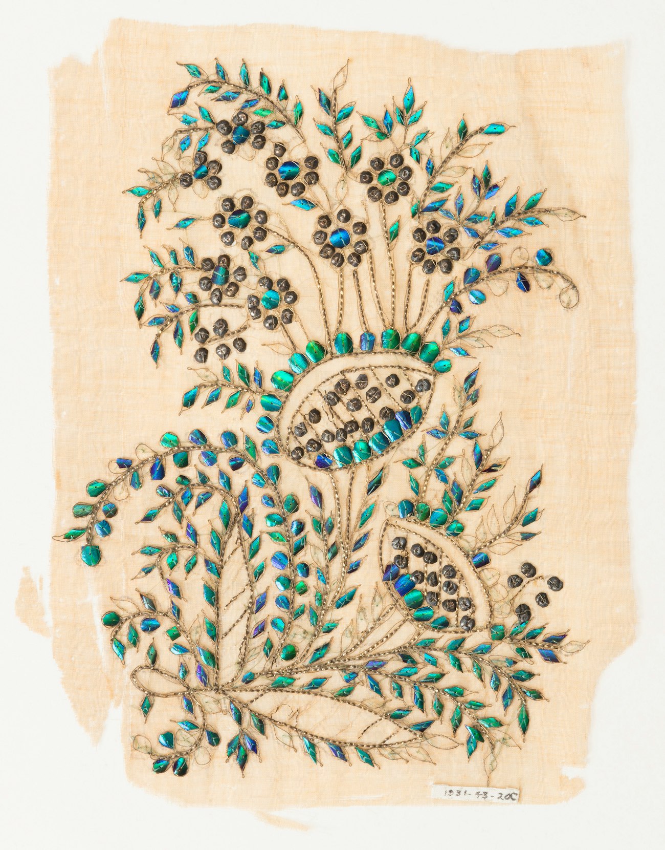 Off-white cotton sheer ground with embroidered design of a stylized floral spray with two large blossoms and numerous small ones curving to the left. The vines are executed in gold foil strips, the small flowers in gilt sequins, and the leaves in beetle elytra. 1931-43-20. Collection of Cooper Hewitt Museum. Image via public domain, Wikimedia Commons