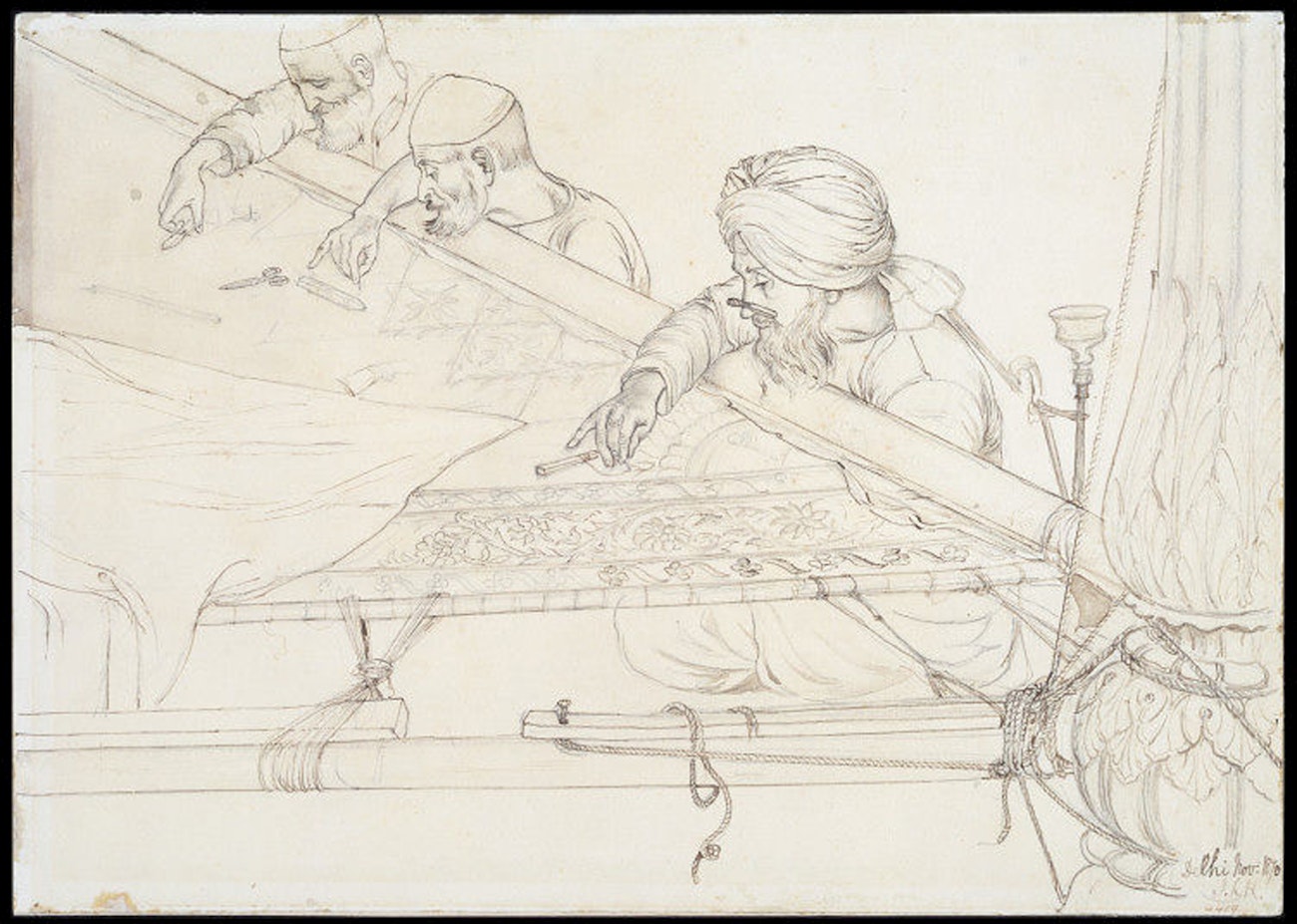 Zardozi embroiderers at work in 1870 India. Delhi Nov 1870 J.L.K 4419: On Verso, 30. Gold embroidery Delhi. J.L.KIPLING. Image via public domain, Wikimedia Commons