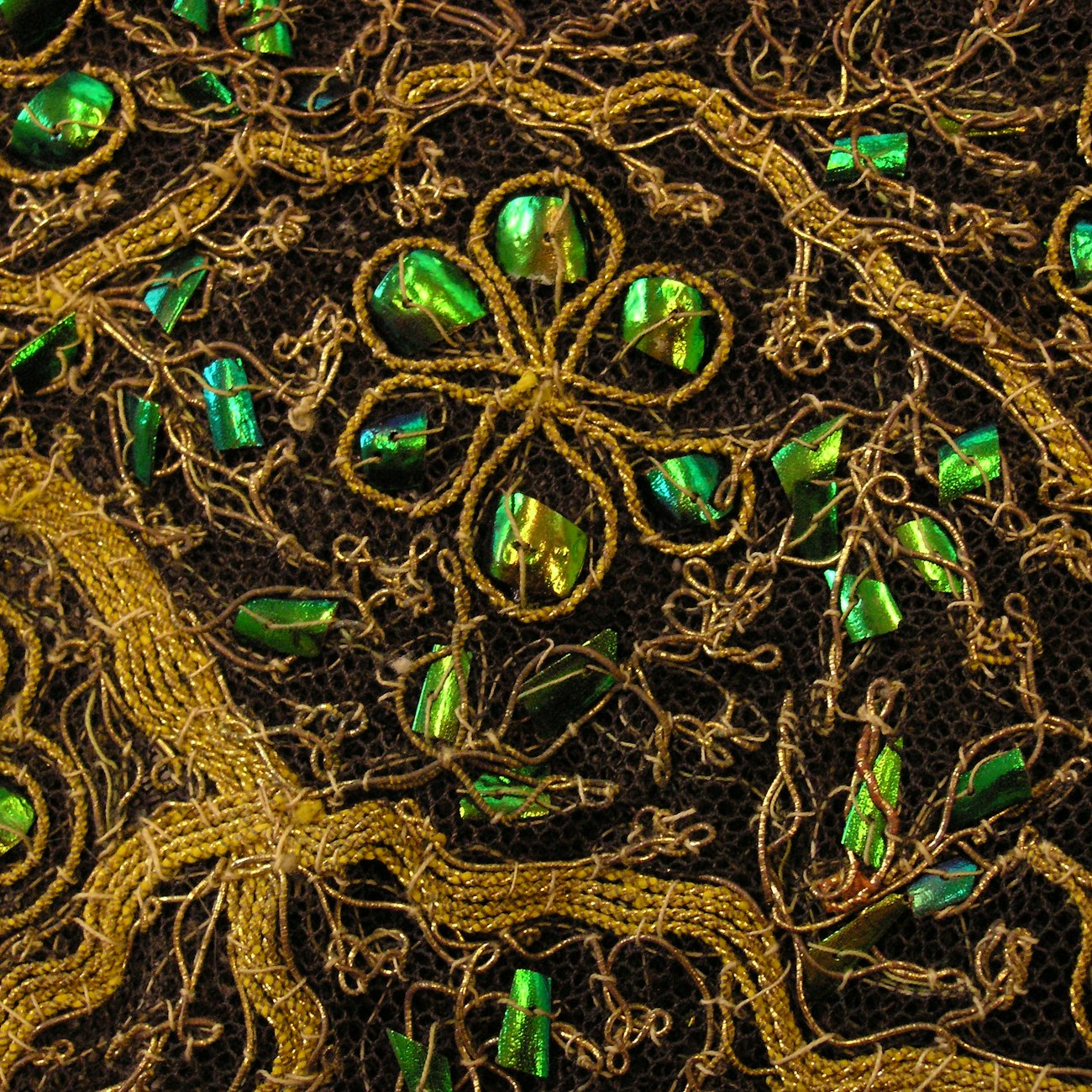 Black skirt, silk net with couched gold and java beetle-wing embroidery, Collection of Auckland Museum Tamaki Paenga Hira, 1994.201, T1636. Image via public domain, Wikimedia Commons