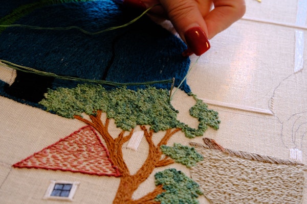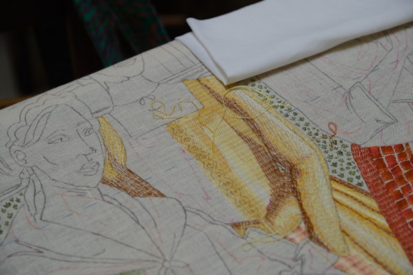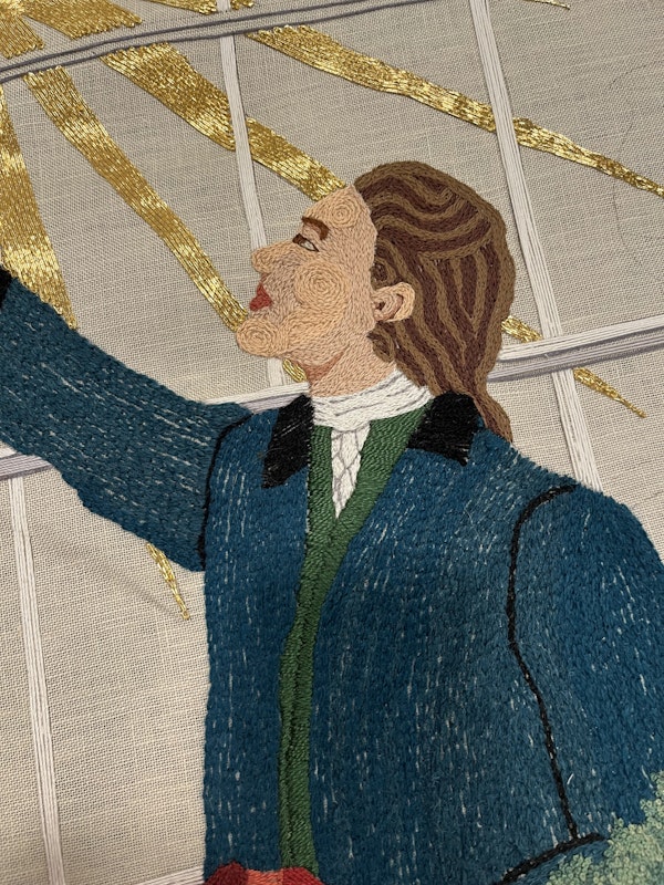 Individual needlework artisans from communities across the eastern United States are stitching the panels along with members of local collectives and Embroiderers’ Guild of America chapters. They gather at local historical sites and cultural institutions that host the stitching sessions, so they can work on panels in community spaces. These venues also help engage the public with the project as it progresses. Enjoy hearing stitchers for the New Jersey tapestry talk about their stitching experiences in this video.