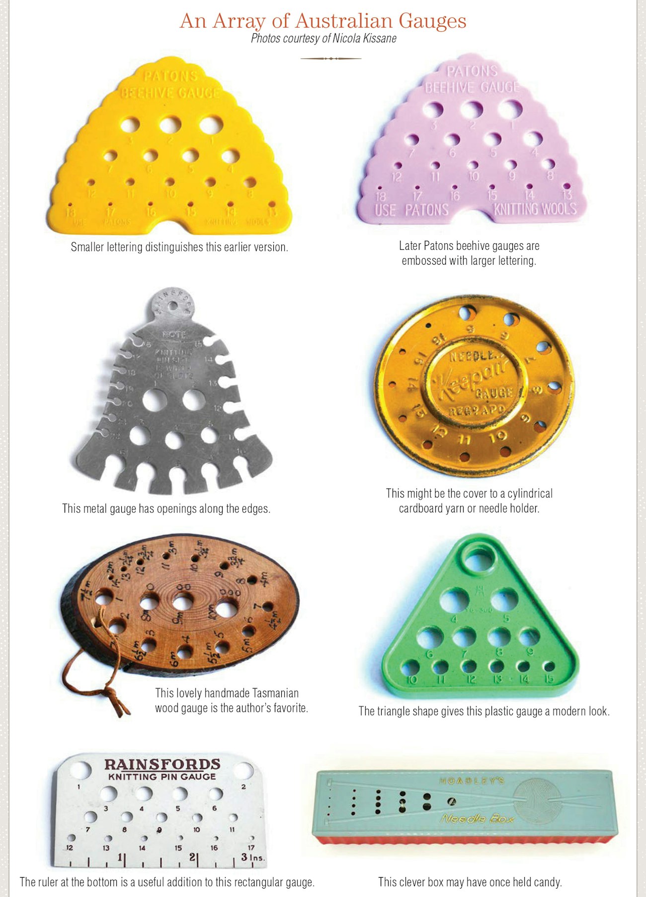 A favorite in my personal collection is a handmade oval gauge, with sizes in both imperial and metric, made from a slice of Tasmanian horizontalis wood. This is marked in imperial (000–14) and metric (10–2 mm) sizes and has a leather loop to keep it at hand. Needlework object collectors will be enchanted by the extraordinary variety of gauges, both old and new, that were manufactured in Australia from all types of native and non-native materials.
