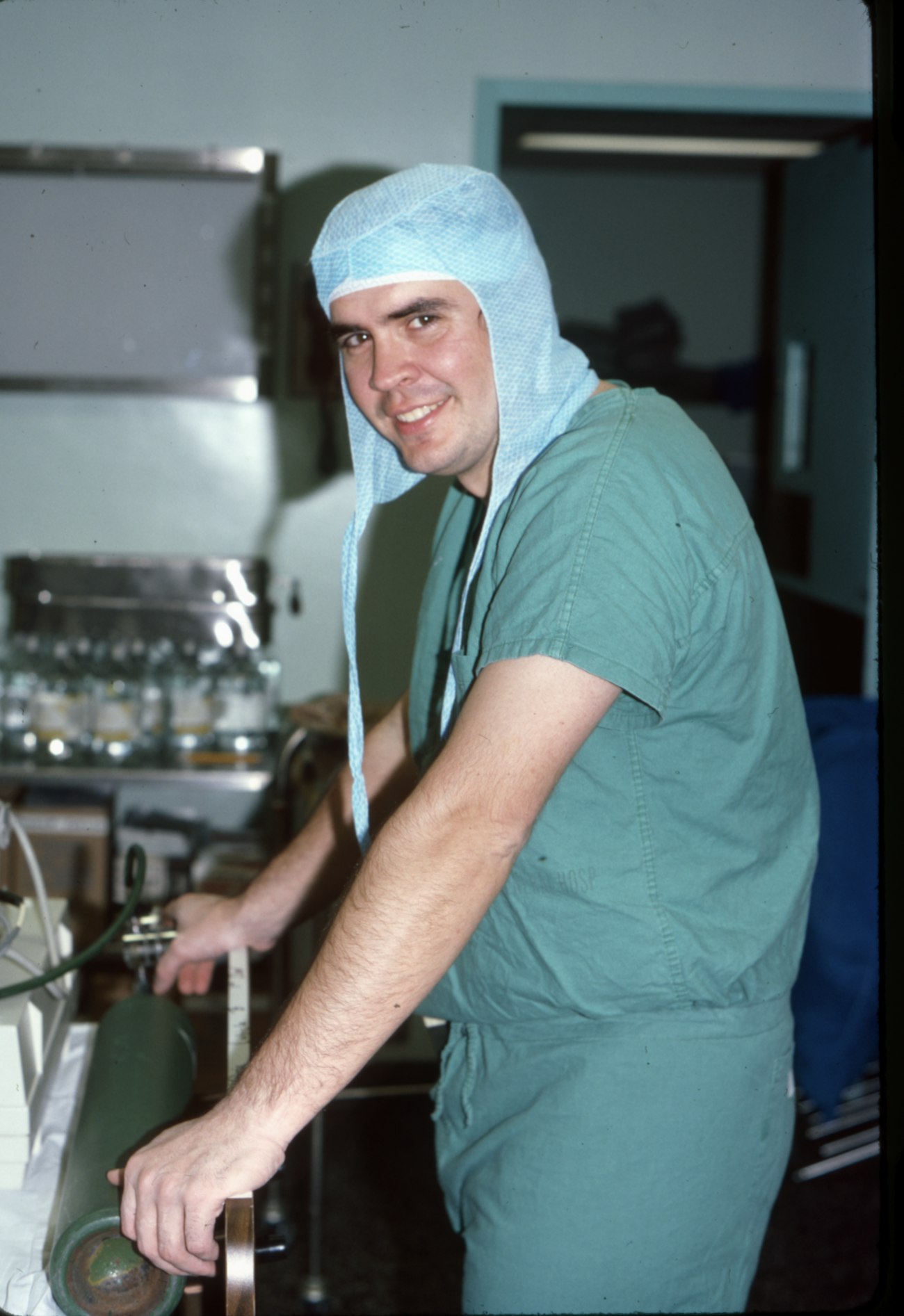 A doctor scrubs in for surgery, 1979, Massachusetts General Hospital.