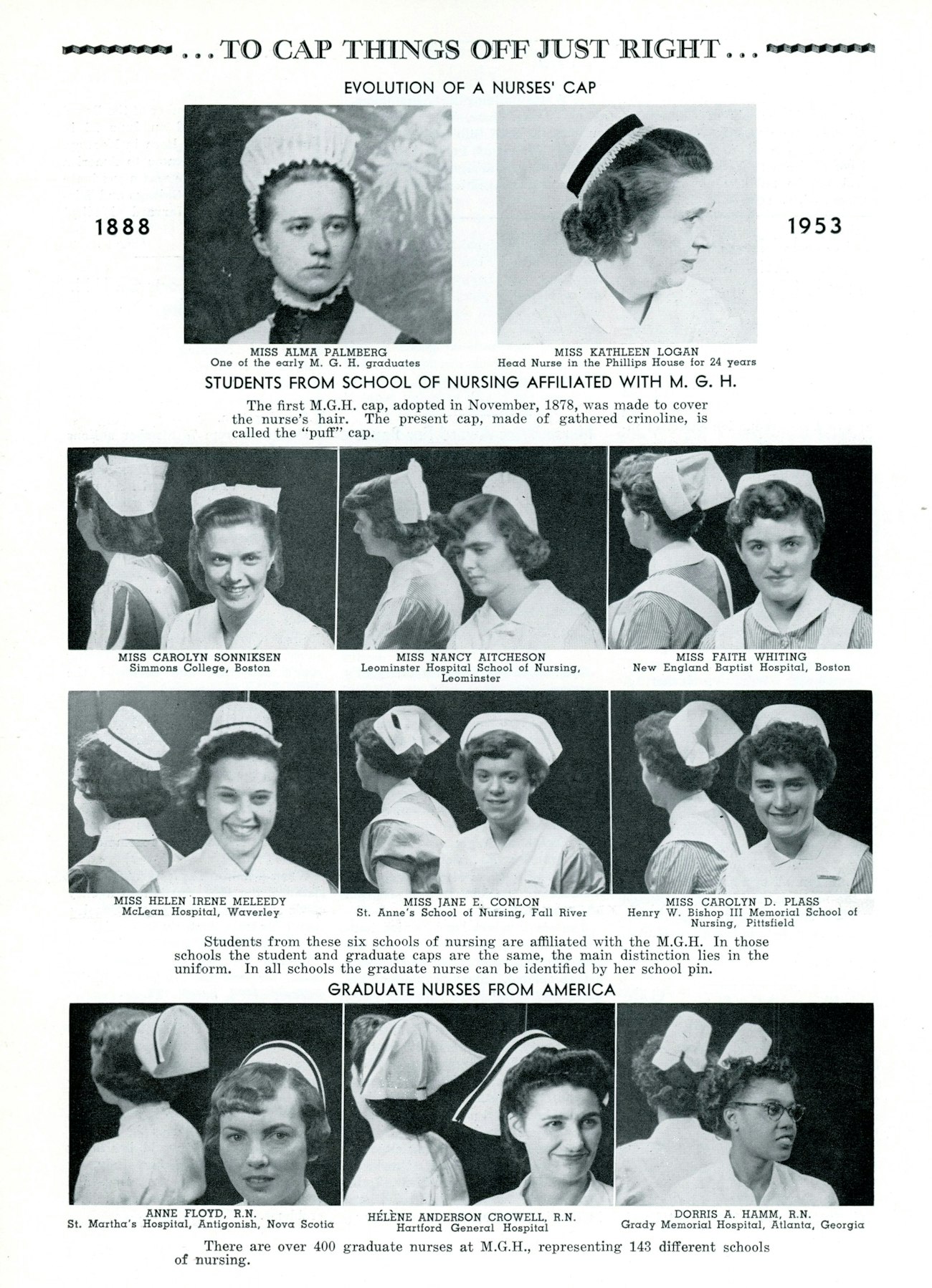 Evolution of crisp white nurses’ caps at Massachusetts General Hospital, in 1888 and 1953.