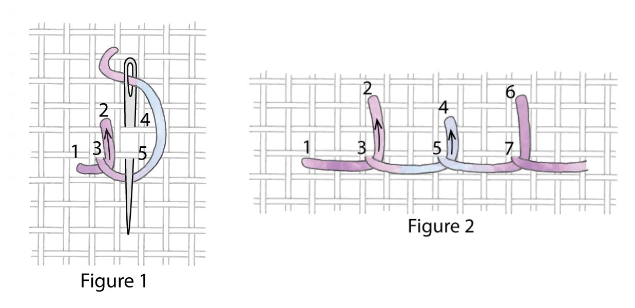 The buttonhole stitch (Figure 1) was historically used to strengthen the cut edges of buttonholes but developed into a decorative surface-embroidery stitch with numerous variations by simply modifying the height, spacing, and angles of the legs and by adding additional stitches to and around the basic stitch. This stitch belongs to the large family of flat and looped stitches and is closely worked together with no background fabric visible between the stitches.