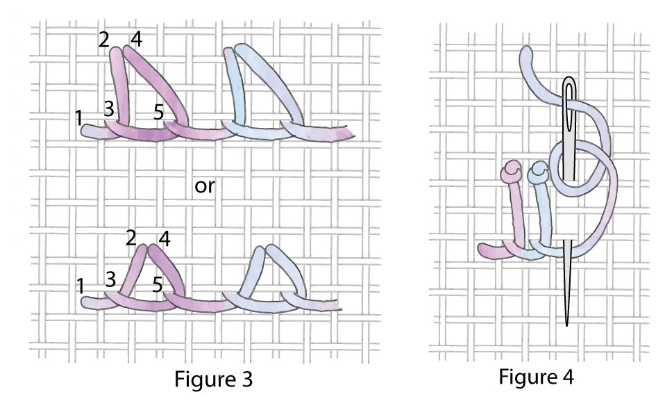 The buttonhole stitch and all of its variations can be worked on either evenweave or nonevenweave (plain) fabrics and with many types of thread or yarn. Its best-known variation is the versatile blanket or open buttonhole stitch (Figure 2), which is simply the buttonhole stitch with its upright legs spaced at varying distances apart. Unfortunately, the buttonhole and blanket stitches have lately become almost synonymous because of their misnaming by some present-day authors and designers, but I strongly feel that the basic distinction between them, leg spacing, should still be acknowledged.