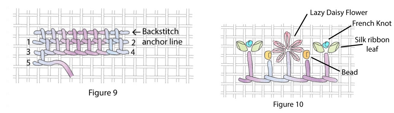 A few of the better known and more widely used variations of the buttonhole and blanket stitches include the closed (Figure 3), open (Figure 4), knotted (also known as knot or Antwerp edging, Figure 5), crossed (Figure 6), buttonhole wheel (Figure 7), double (great for couching, Figure 8) and detached (Figure 9). The detached-buttonhole stitch is worked entirely on the surface of the background fabric except at the beginning and ending of each stitch row. This variation was extensively used in Elizabethan-era raised embroidery. Many additional stitches, buttons, and beads can be added to these basic two stitches (Figure 10) and are especially abundant on crazy quilts, both modern and antique.