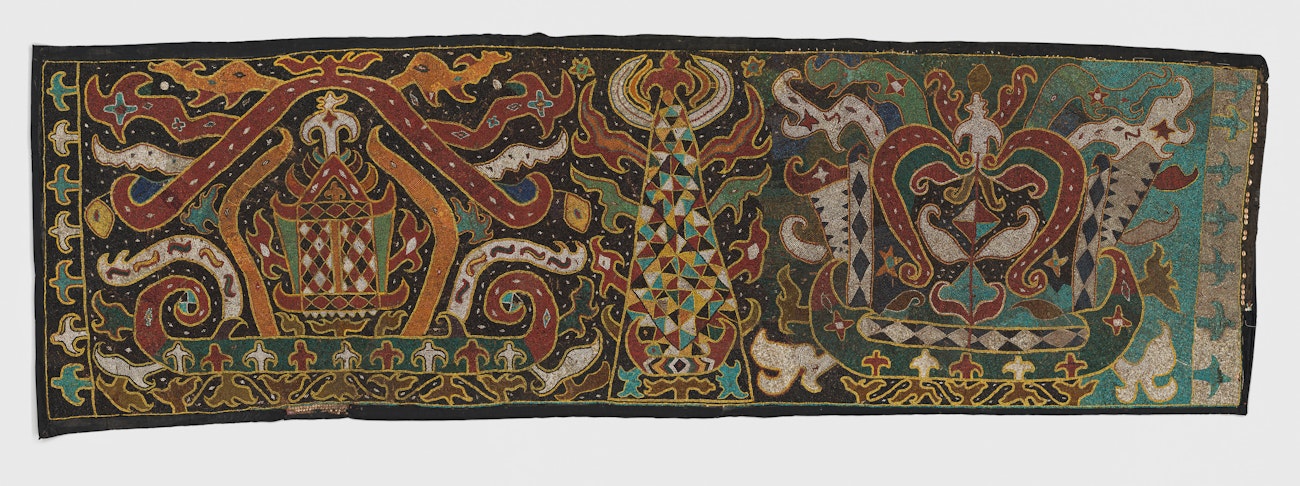 Palepai maju (ceremonial banner) eighteenth to nineteenth century Indonesia, Sumatra, Lampung fiber, ceramic and glass beads, cloth, nassa shells. Gift of Anita E. Spertus and Robert J. Holmgren, in honor of Douglas Newton, 1990 Photo courtesy of the Metropolitan Museum of Art