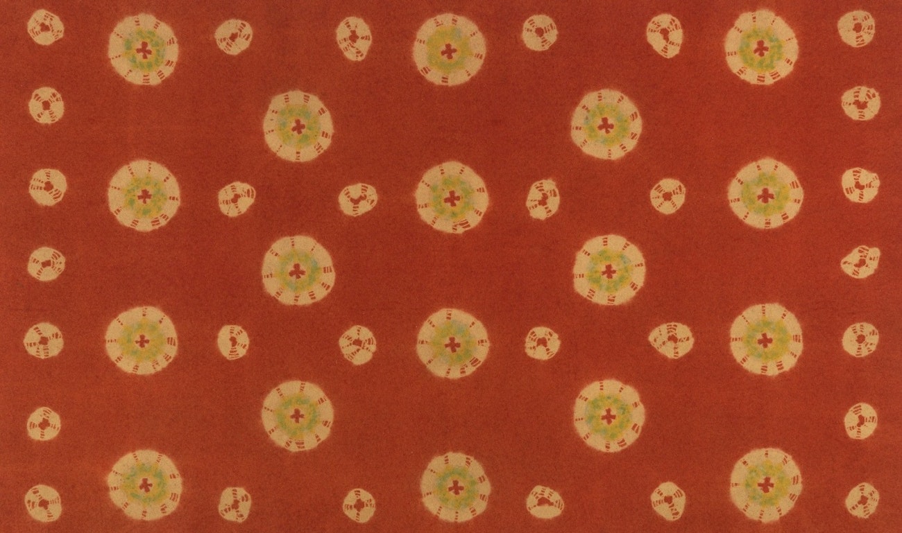 A late nineteenth-century mosen, a type of rug used in Japanese tea ceremonies, made from felted wool patterned with tied resist dyeing. Museum purchase from General Acquisitions Endowment Fund. Photo courtesy of the Cooper Hewitt, Smithsonian Design Museum