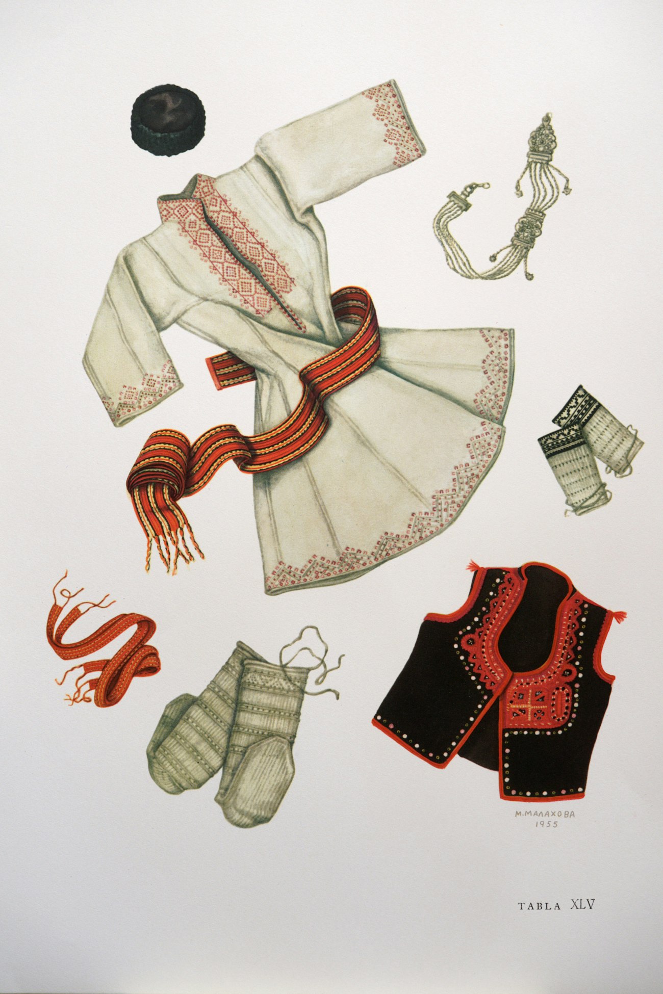 In 1963, the Ethnological Museum in then Skopje, Yugoslavia, published what has become an icon in the study of ethnic textiles of the region: The National Dresses of Macedonia, edited and with interpretive text by Vera Klic̆kova, director of the Ethnological Museum, and watercolor illustrations by Marija Malahova and Olga Benson. The boxed set of posters Ali discovered were prints of the illustrations for the book. It features 61 color illustrations in total, including eight bridal costumes and five men’s costumes together with all their accessories, arranged in 46 plates. In 15 separate supplements are details of the individual garments for each costume.