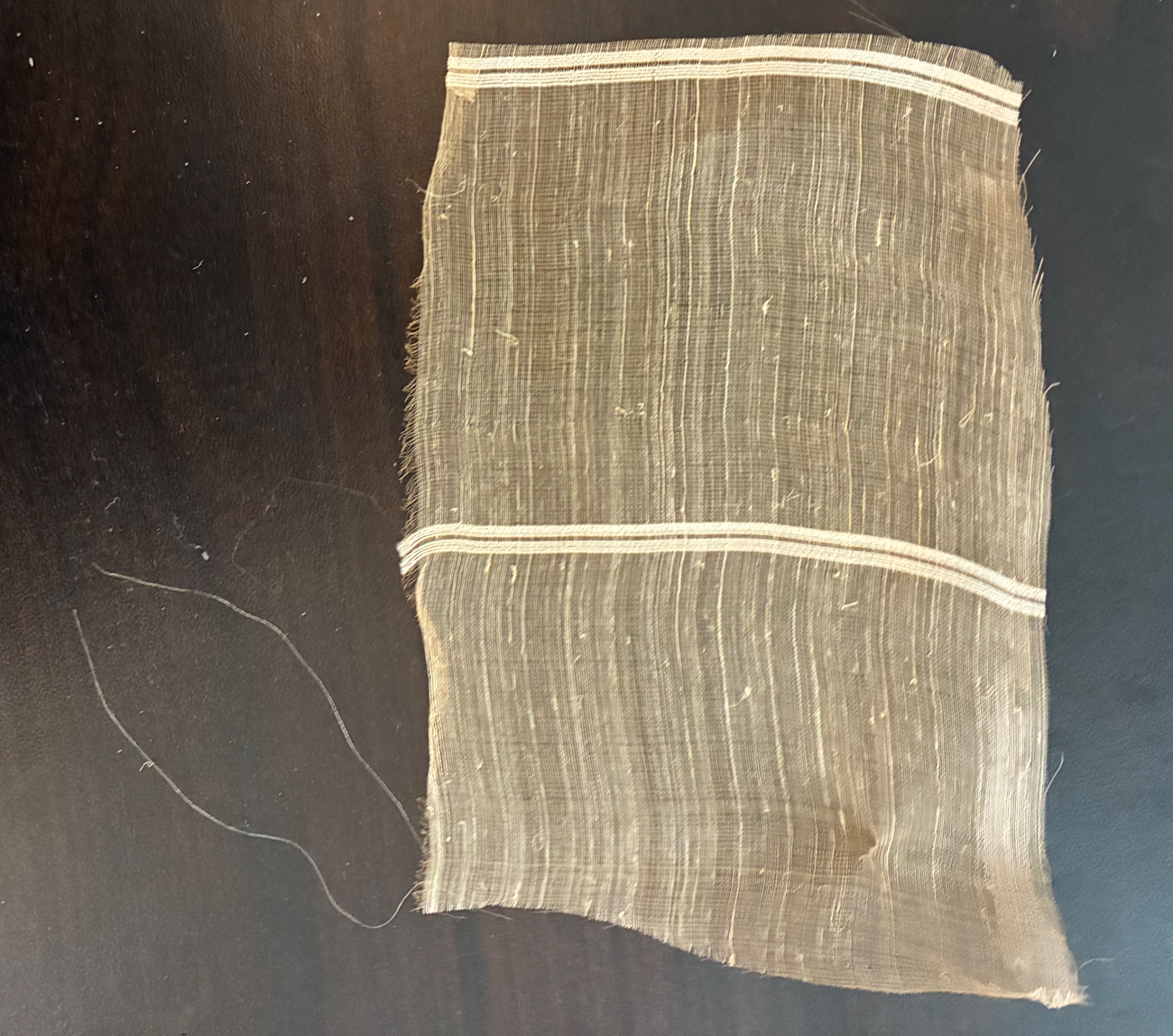 A sample of piña-silk cloth. Note the knot on the unraveled strand. Photo by Kathleen Bennett, 2025