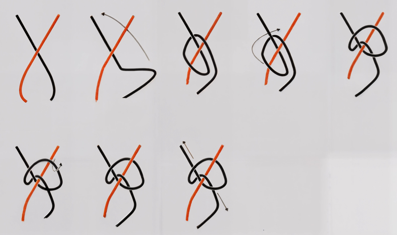 Instructions for tying the pineapple fiber threads. First, cross the left (red) fiber over the right (black), then form a loop in the lower part of the right fiber. Bring that loop over the left (red) fiber and loop itself (black fiber). Pull the lower part of the loop up and over the top of the (red) fiber and gently pull on both sides of the black fiber to lock the knot. Illustration by Kathleen Bennett, 2025