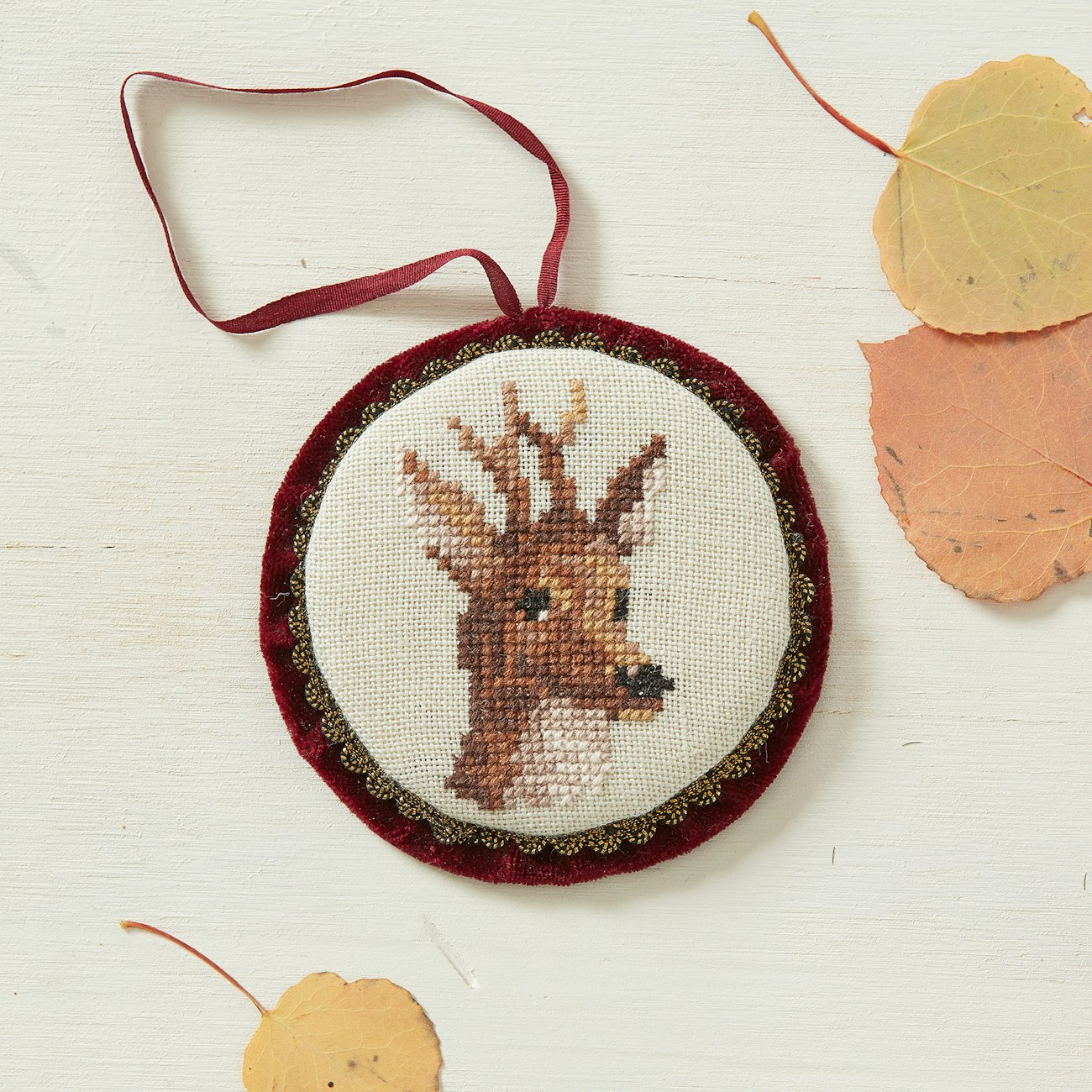 Originally, Berlin-work patterns were stitched with wool, but I chose cotton floss to convey the subtle shading of the reindeer fur. The metallic trim and silk velvet background fabric I used for making the ornament were manufactured in the 1890s. The readily available materials listed in the pattern also will create an ornament with all of the hallmarks of a Victorian piece.