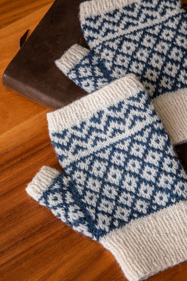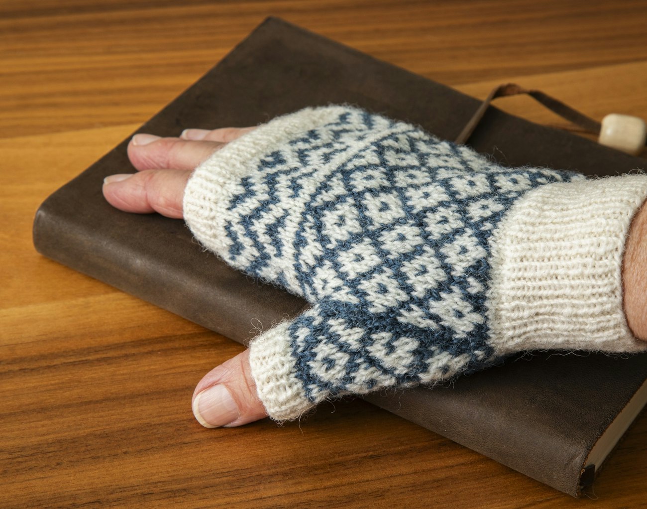 These fingerless mitts were inspired by surviving colorwork sock fragments dating from circa 1100–1400 AD and originating in North Africa. I have recreated the intricate blue and white patterns from photographs of an extant piece in the George Washington Textile Museum. The original socks were likely plant-dyed using either indigo or woad. I chose Earth, a natural indigo-dyed fingering weight yarn from Glasgow dyer Woollenflower, for this pattern to keep the historic link.