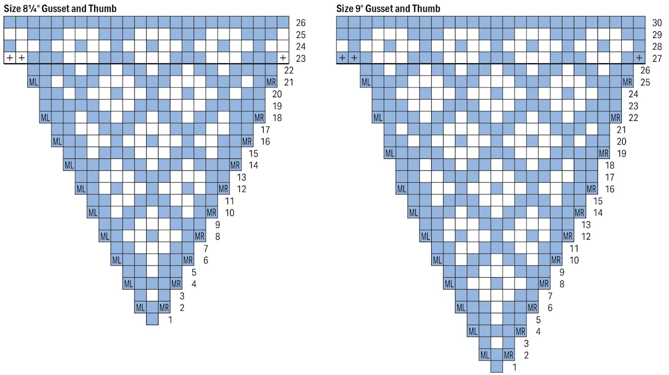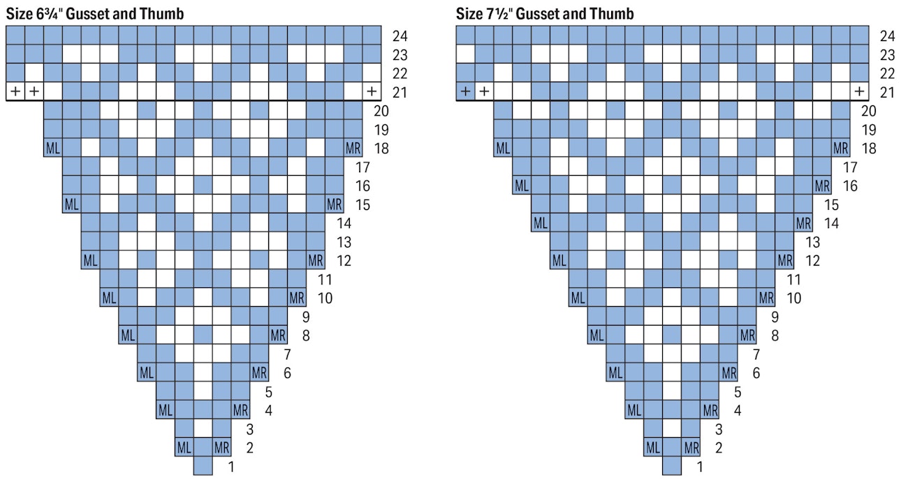 Redistribute sts evenly if necessary, and work 3 more rnds of thumb chart, ending with Rnd 24 (24, 26, 30).