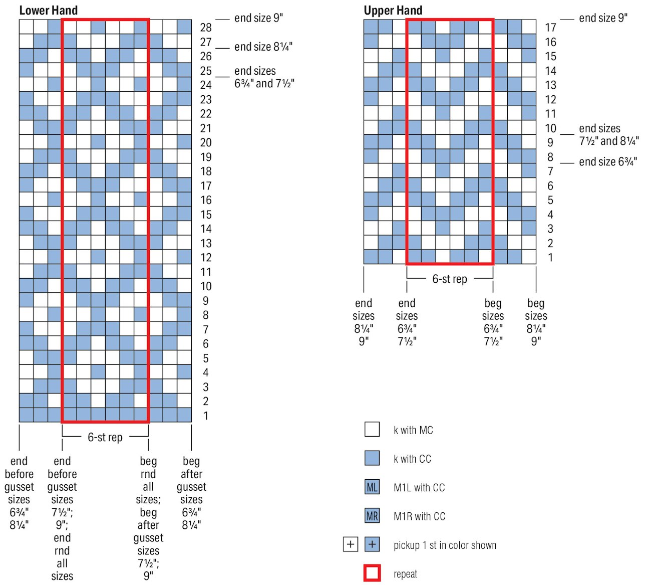 Next rnd: Removing gusset m in center as you come to it, work Rnd 1 of Upper Hand chart over 54 (60, 66, 72) sts, beg and ending where indicated for your size.