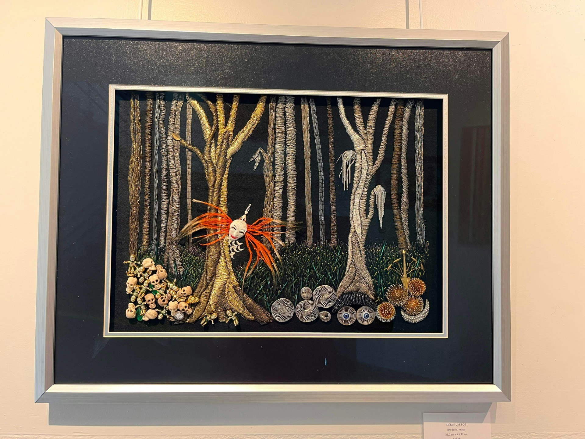 Our northern neighbor, Céline Legault, who works as an embroidery artist in Québec, sent us a photo of her recent “Once Upon a Time” piece, all handsewn or embroidered in satin stitch, running stitch, and couching.