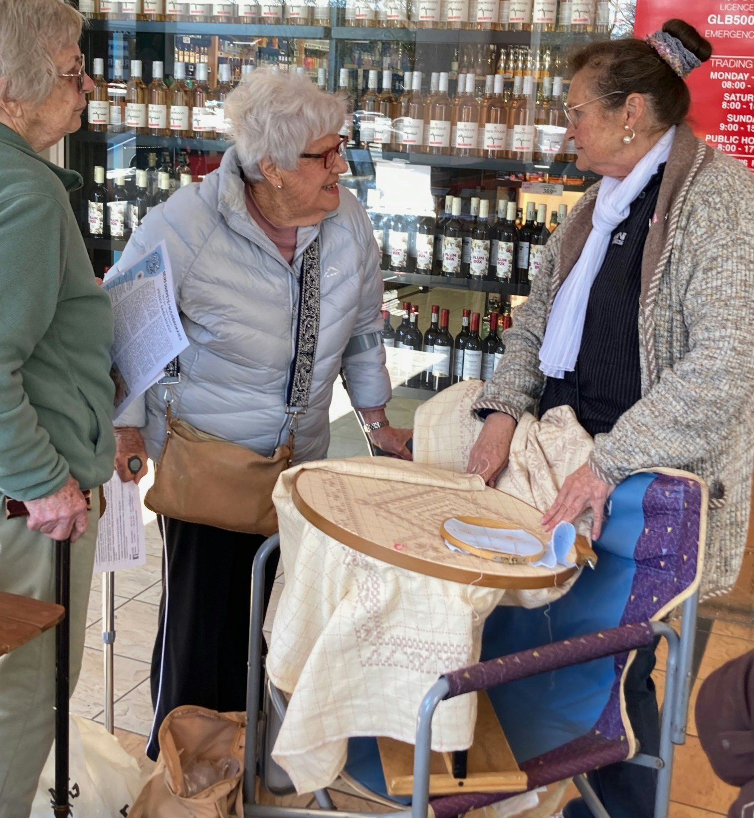 Frequently, I ask readers to share what they’re making or have made. On World Embroidery Day, I encouraged readers to tell us how they celebrated—and to send photos. And they did. The Fine Art Embroidery Guild in Pretoria, South Africa, told us they celebrated World Embroidery Day in front of a needlework shop and a liquor store! Tina wrote to us that on a beautiful sunny day (in winter), “26 ladies showed up with folding chairs and embroidery or other handwork, and we just enjoyed each other’s company for about 4 hours. People visiting the shop or walking by to other shops stopped, chatted, and admired a little display of our embroideries.”