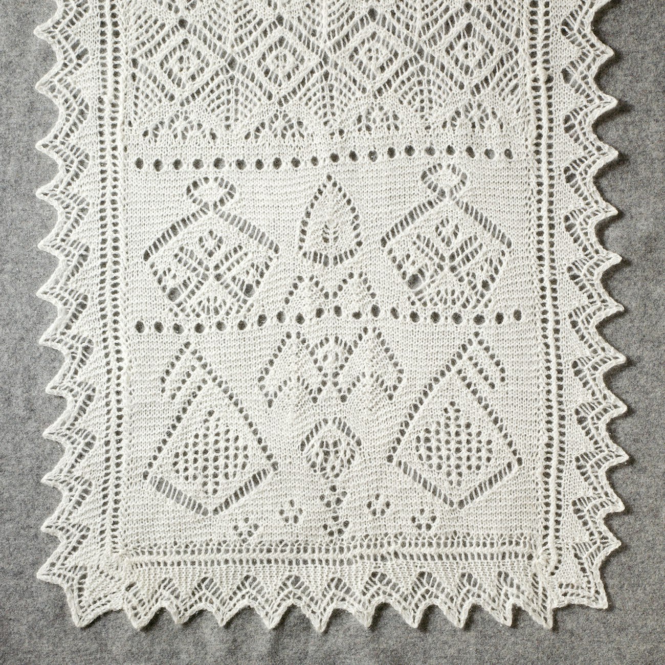 The group of five-petaled blossoms at the beginning of the border in the stole represents a regional flower, Shetland Mouse-Ear, alternatively called Edmonston’s Chickweed and, for good measure, Edmonston’s Mouse-Eared Chickweed, which may have brought comfort to Essy as she sat weeping by the seashore. The Paisley Pinecone, or Teardrop, stands for her unhappiness at this time, and the mesh filling for her father’s fishing nets. Between the two Teardrops are the ewe and, flying over her, the crow. The Horseshoe pattern indicates the mode of transport that the king and his son used to arrive in Essy’s area in search of a bride for the prince. Patterns representing beads, fans, and mirrors show some of Essy’s new life as a royal princess.
