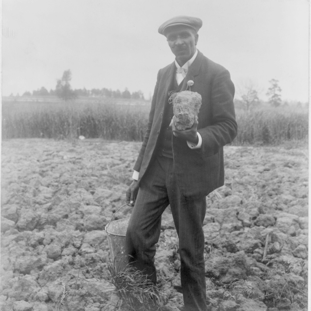 George Washington Carver standing in a plowed field, likely at the Tuskegee Institute, holding soil in 1906. Photo by Frances Benjamin Johnson, Booker T. Washington Collection. Courtesy of the Library of Congress, Prints and Photographs Division