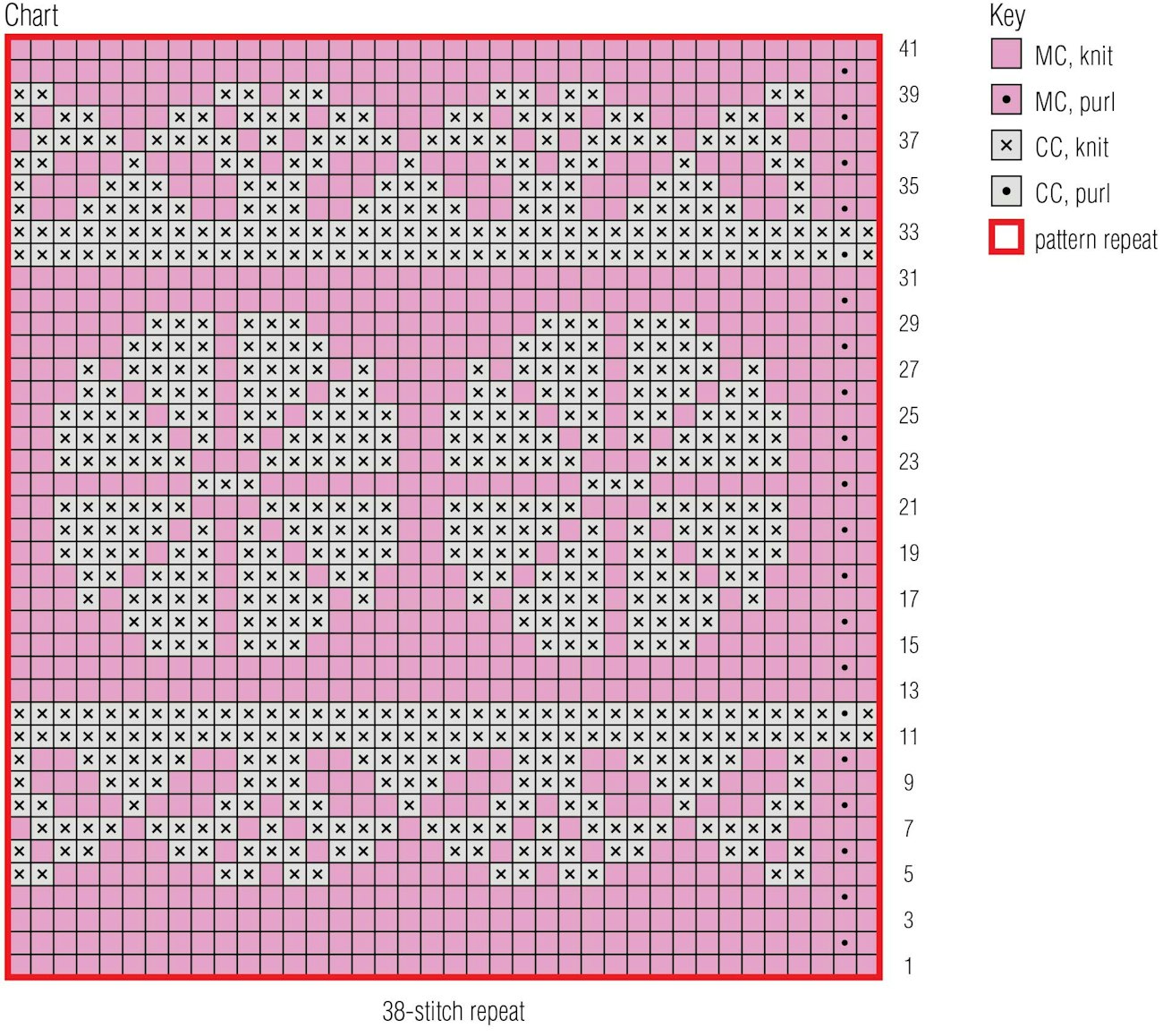 Set-up Rnd: Work 38 sts from Rnd 1 of chart 2 times around.
