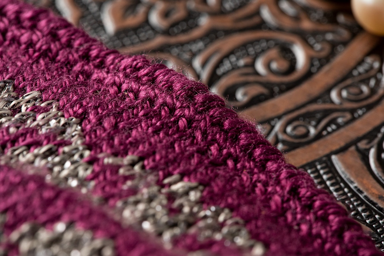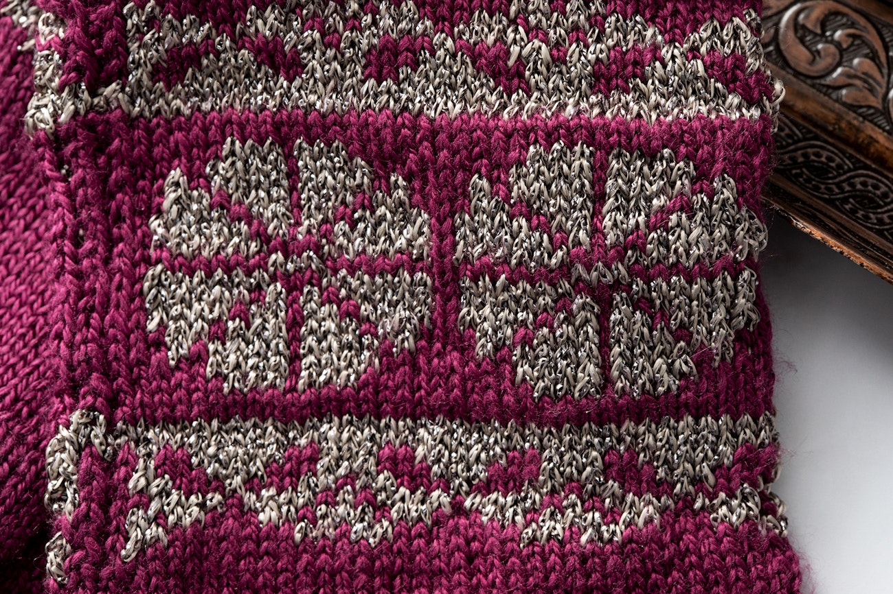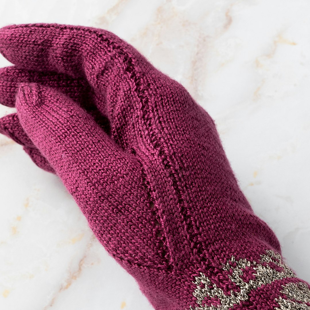 The main color selected is Bordeaux, a rich wine red, but the yarn is available in many colors, all suitable. The metallic thread here is Gunmetal, which has luster without too much bling. It is also available in a wide range of shades. This silk yarn has very little elasticity, so the two yarns must be stranded loosely in the colorwork cuff because the fit is snug. The chart includes sections where the unused yarn will be carried across the back of the work for more than six stitches; you may prefer to trap it with the working yarn to prevent long floats.
