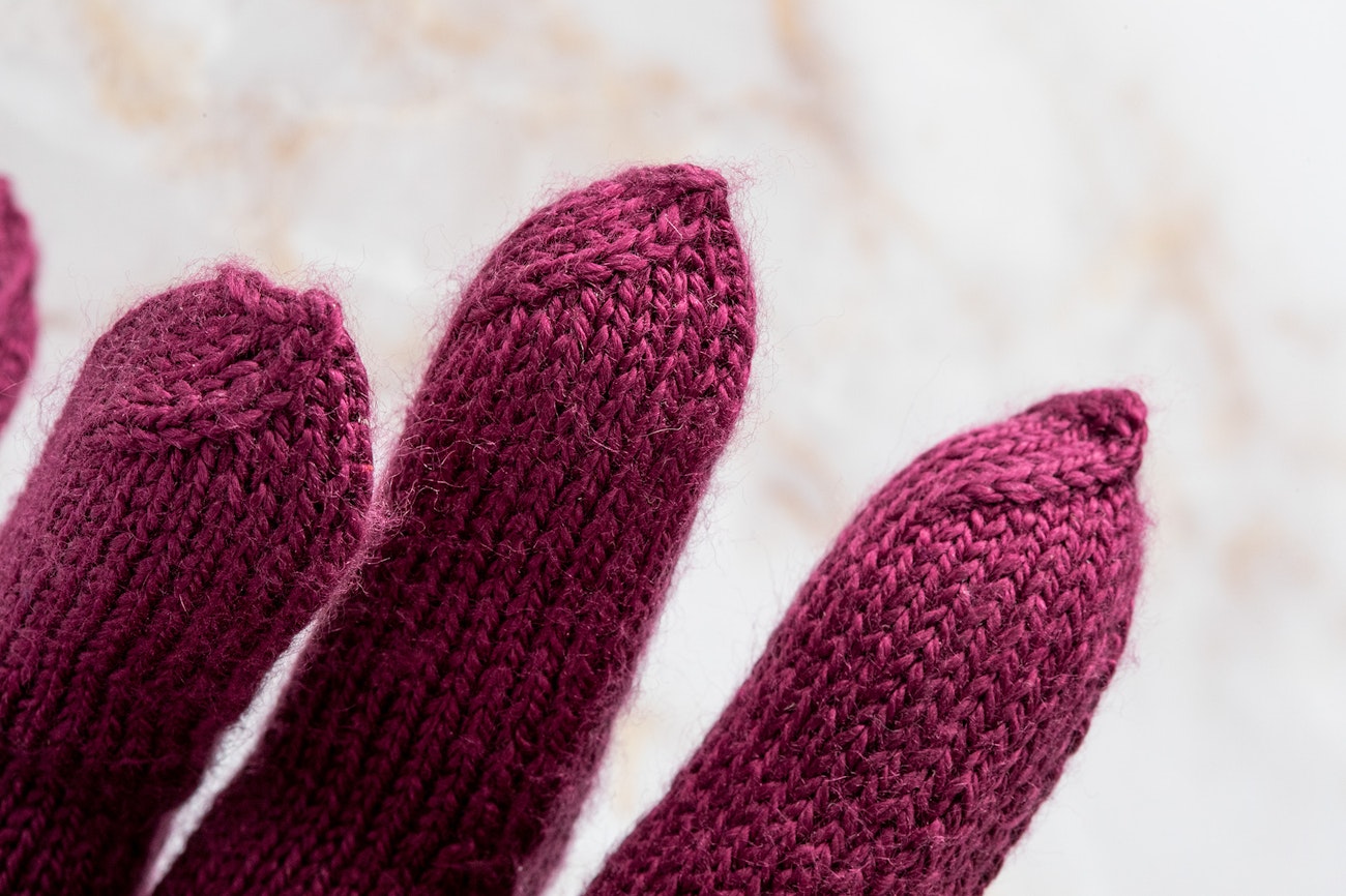 Weave in ends, using yarn tails as necessary to close any holes at the base of the fingers and thumbs. Steam lightly.