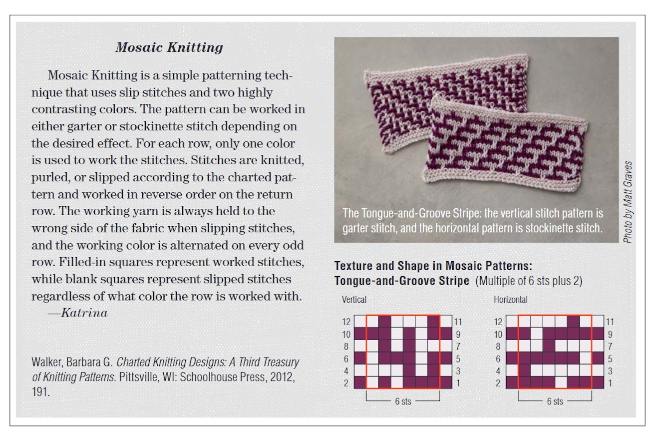 After a few years of earnest collecting, I had hundreds of patterns, sorted into the categories of Simple Knit-Purl Combinations, Ribbings, Color-Change Patterns, Slip-Stitch Patterns, Twist-Stitch Patterns, Fancy Texture Patterns, Yarn-Over Patterns, Eyelet Patterns, Lace, Cables, and Cable-Stitch Patterns. This collection was published in 1968 as A Treasury of Knitting Patterns. At the end of the book, I invited knitters to contribute any other patterns that might have been handed down in their families. A number of readers responded, and in addition to these, I was beginning to invent my own original patterns. The collection grew and grew and became the much larger A Second Treasury of Knitting Patterns published in 1970. This book had some new categories, such as Fancy Color Patterns, Fancy Texture Patterns, Lace Panels and Insertions, Borders, Edgings, and the now-famous two-color designs of my own inspiration, which I named Mosaic Knitting, a term that I invented for my new colorwork technique. This is an easy technique that uses only one color at a time, switching every second row or round, without the bother of stranding. When I first visualized this technique, I wondered, “Why didn’t people think of this before!”