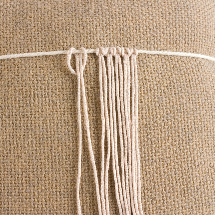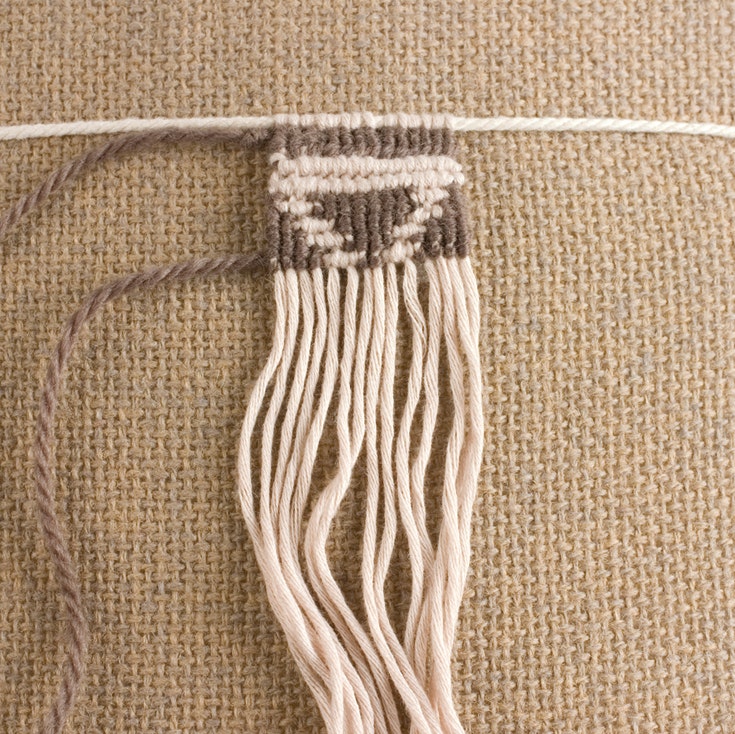 Fasten a sturdy header cord to a firm pillow. Loop doubled foundation cords over it using lark’s-head knots.