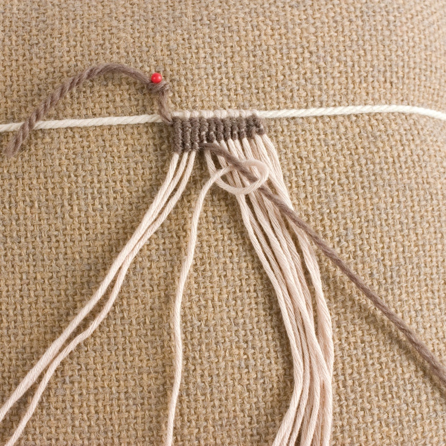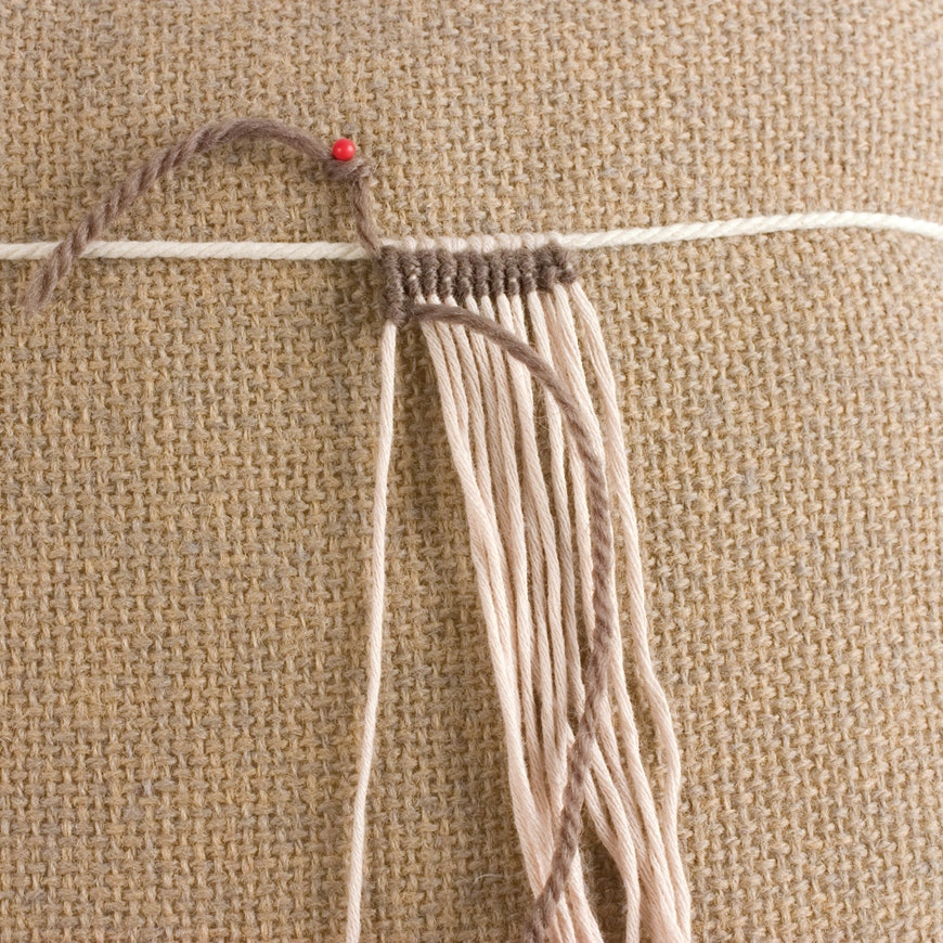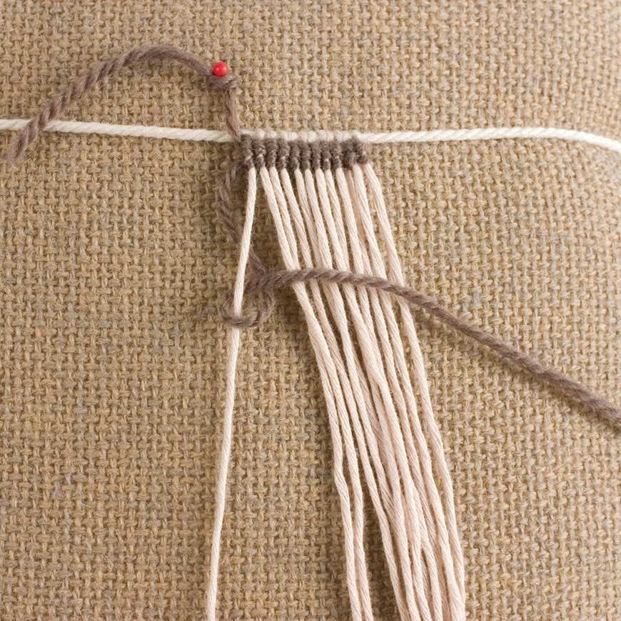 Fasten a long strand of yarn of contrasting color at the left edge of the work. Pass it around the first foundation thread in a half hitch, as shown. Then repeat, for a double half hitch. (The example shown below has two rows already worked.)