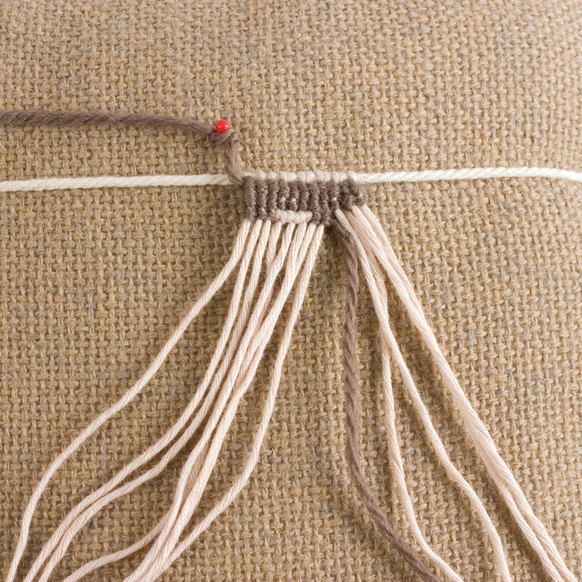 To work a contrasting “pattern” stitch, hold the contrasting thread at a downward angle, and use the next foundation thread as a pattern thread, forming a double half hitch around it. Do this as many times as you wish.