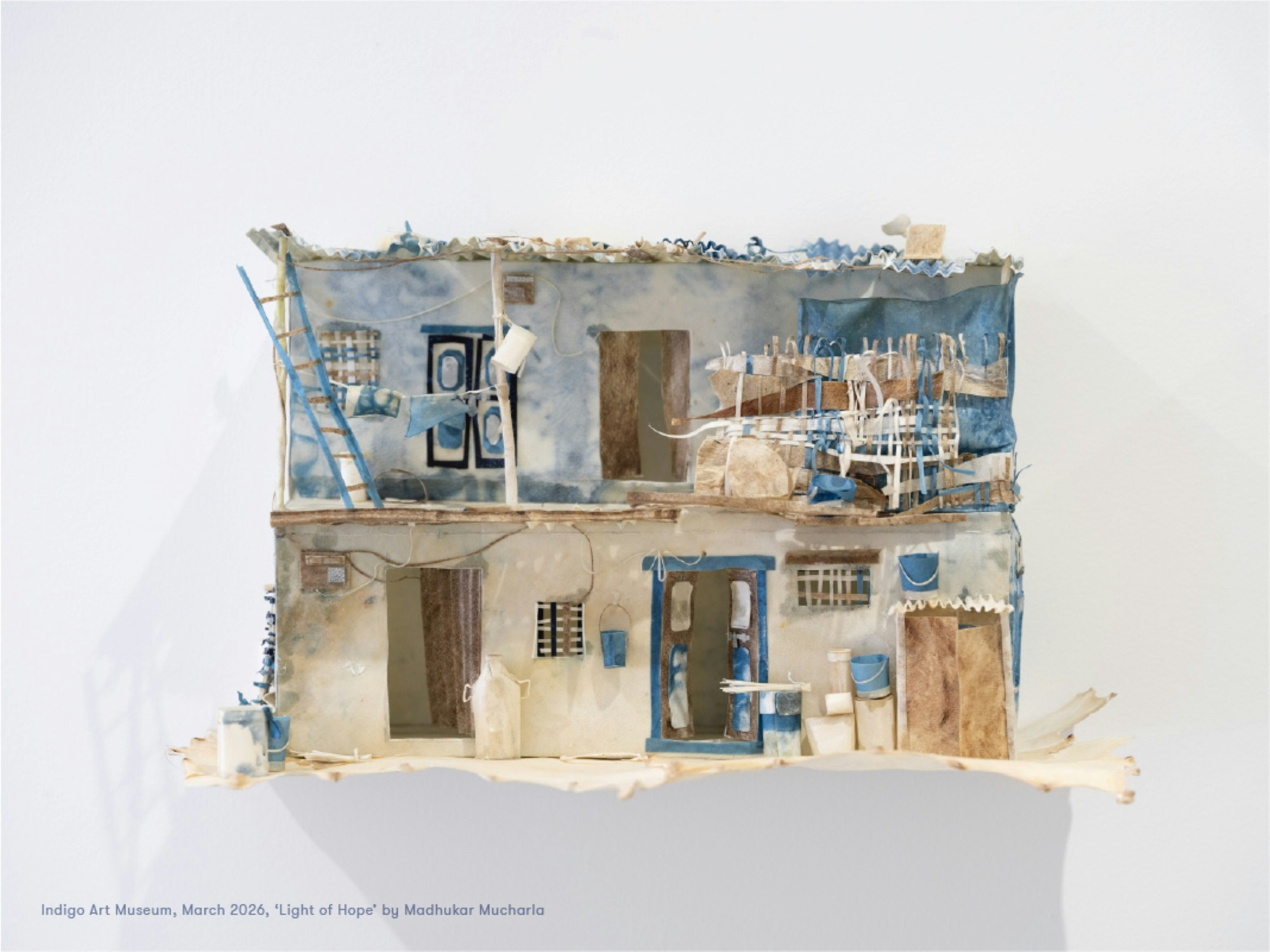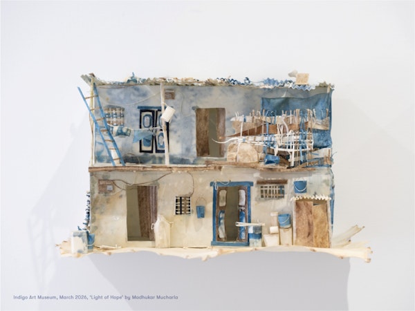 Equally compelling was Mucharla’s installation Light of Hope: seven rawhide houses dyed in indigo, inspired by visits to informal settlements and the stories of displacement encountered there. Fine strips and shapes of leather were folded, joined, and stitched using traditional techniques to form clusters of three-dimensional houses. These miniature settlements conveyed both realism and empathy, capturing the resilience and rhythm of life within such communities.