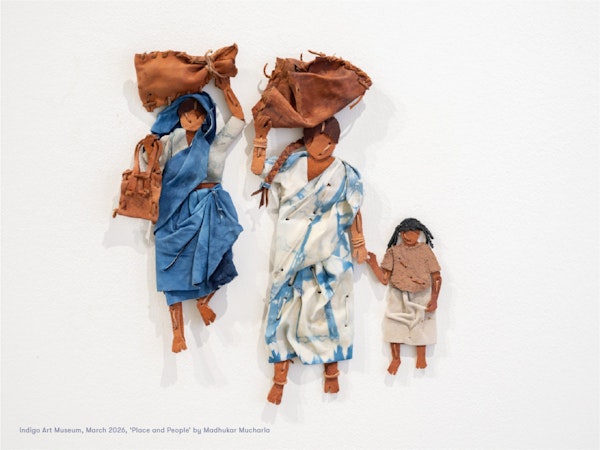 The exhibit expands out from the galleries of the Indigo Museum to its parent museum, Kasturbhai Lalbhai Museum next door. Entering the first section of the main museum, I was immediately drawn to the work of Madhukar Mucharla. His installation titled Place and People featured twelve leather puppets dyed in indigo and crafted using traditional chappal-making techniques. Each piece of leather was sewn, knotted, plaited, and tied to depict scenes of everyday life—figures engaged in routines familiar from streets and villages. The softened leather draped naturally, forming clothing-like textures—trousers, saris, blouses—and lending the puppets a lifelike presence.