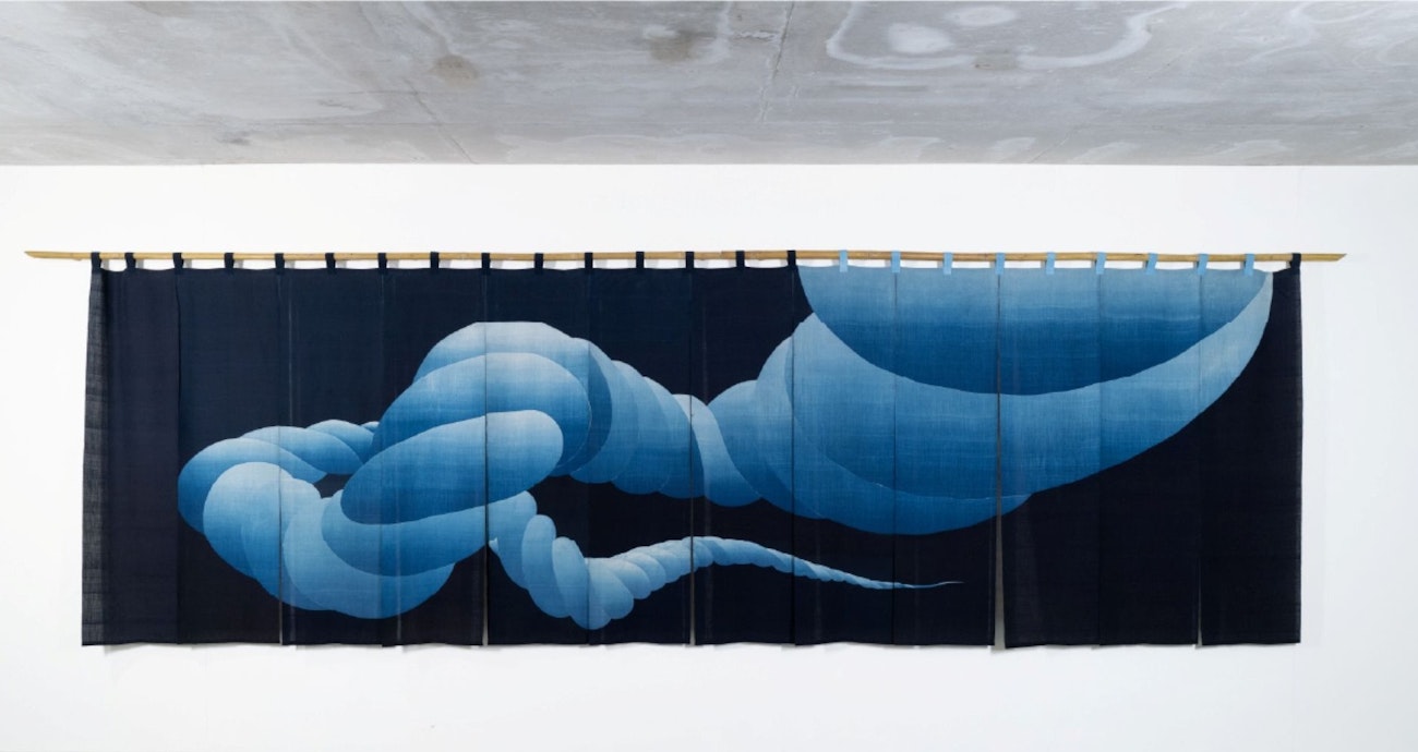 From Buaisou’s practice emerged works of remarkable precision, rooted in a process that felt both meditative and exacting. Rope, made from twisted yarns, appeared as a recurring element, interpreted in different ways across their pieces. Stencils, crafted with rice paste on both sides, met the indigo bath like a hidden language waiting to surface. When revealed, the designs shimmered in contrast—a quiet interplay between restraint and saturation. The central work in this hall was a large noren curtain made of ramie, patterned in gradations of indigo.