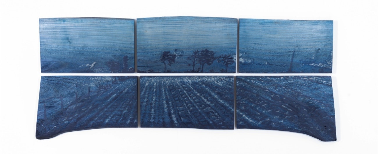Aasha Keshwala of Porbandar, India, explores the monsoon through the tactile language of woodcut and dye. Hand-carved wooden blocks create large-scale prints that establish a dynamic visual framework evoking the drama of rain. These prints are then repeatedly dyed in indigo, gradually building layers of color and texture. Tones bleed into one another, horizons blur, and surfaces deepen into contemplative blues where sky and land seem to merge.