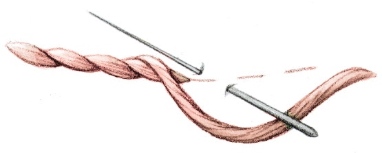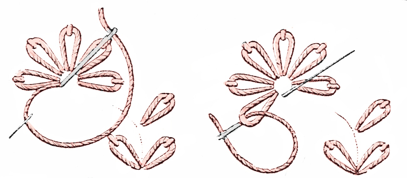 This graceful embroidered vine is adapted from the angel that Juliette Hamelecourt designed for Cartier’s 1974 Christmas window. In a telephone conversation with Juliette, she explained that the fruit was representative rather than a realistic rendering of a specific fruit. Juliette worked the vine portion of the original with three rows of double threaded DMC metallic floss; she worked the leaves with red embroidery floss using the detached chain (also called daisy) stitch; she used a tiny chain stitch, worked in a spiral, to create the fruit.