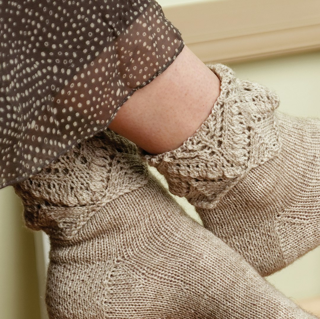 The idea for these dressy anklets came from Marilyn Murphy. I had been thinking about how I could work Estonian nupps (in Estonian, “button” or “knob”—small bobbles) into a sock pattern, and she suggested putting them on the turned-down cuffs. In my adaptation of a lacy edge used on Estonian shawls, the nupps are pleasingly subtle.