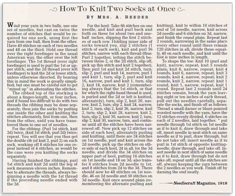 A 1918 issue of Needlecraft magazine included Mrs. A. Reeder’s instructions for knitting two socks at once. Those instructions are shown here.