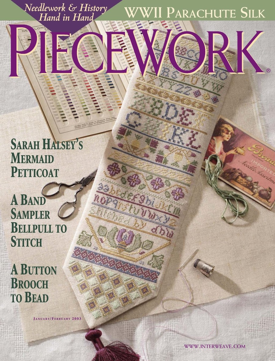 Learn about quilted petticoats such as Sarah Halsey's mermaid petticoat from the 18th century United States, then quilt a lion motif based on the pattern. Discover the history of Norway's embroidered bunader, a brightly embroidered traditional costume worn to celebrate Norway's Constitution Day. Deborah Pulliam explores Taste, Art, and Design in Great Britain from 1500 to 1900, a textile and clothing exhibit from London's Victoria and Albert Museum. Enjoy the story of Bill and Wilhelmina van Niekerk's handstitched parachute silk wedding dress and handstitched parachute silk christening gown. Then, explore the projects you can do on your own. These include a gentleman's waistcoat to crochet, a Quaker motif needle holder to cross-stitch, a button broach to bead, and a Swiss collar to knit. Join Deborah E. Kraak and Barbara C. Abrams in reflection about little girls sewing for their dolls. Plus, The Needleworker explores the feather stitch, a looped stitch that alternates from one side to the other.
