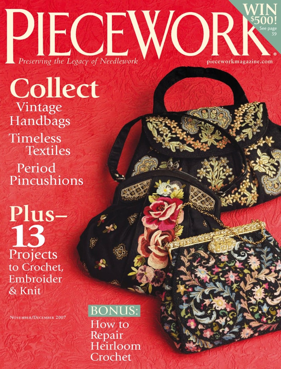 Get 13 crochet, embroidery, and knitting projects, learn how to repair heirloom crochet, and discover vintage handbags, timeless textiles, and period pincushions to collect.
