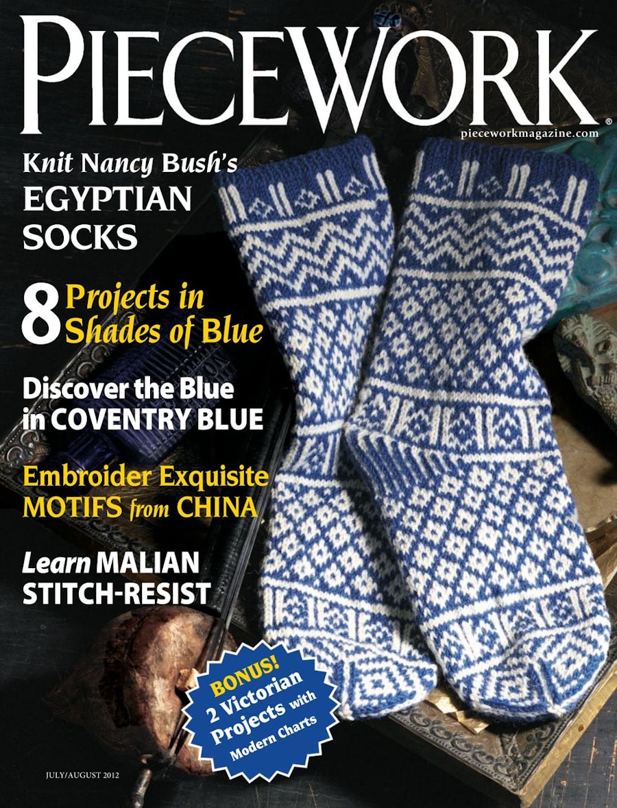 Login Purchase Single ProductBlue jeans, blue moon, Rhapsody in Blue, Colorado sky blue, "Blue Suede Shoes," Texas bluebonnets, cerulean, the Caribbean Sea, lapis lazuli. Blue can be striking or soothing. Royalty and religions have used the color for millennia as a symbol of power. From ancient Egyptian socks to stitch-resist cloth in Mali, from "as true as Coventry blue" to Pueblo ceremonial leggings, the July/August issue of PieceWork is dedicated to the color blue. We examine its importance, how it has been used, and how some traditional methods of achieving the color are being preserved. It turns out that tie-dyeing cloth with indigo was introduced to the world long before the 1960s; Native American men knitted and wore ceremonial dark blue leggings; and Chinese embroiderers stitched symbols onto white cloth with blue cotton hand-dyed thread. Explore glorious blue in this issue of PieceWork!
