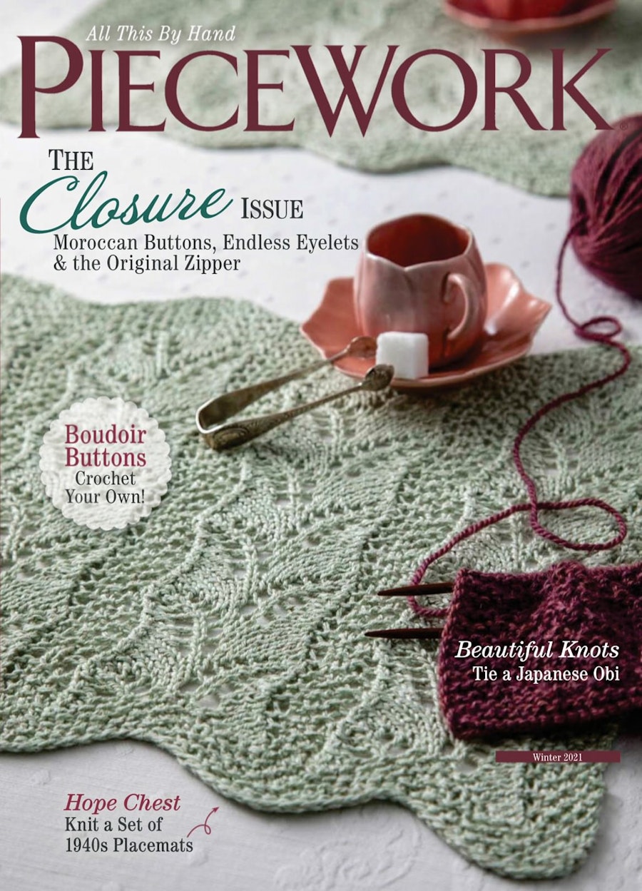 Login Purchase Single ProductWith textiles as our frame of reference, we often understand the term “closure” to mean fasteners of every sort, from buttons and zippers to hook-and-eye closures. However, textiles can also symbolize cultural closure, say, marking the transition from childhood to adulthood for example. In the Winter issue of PieceWork, we look at the ways closures serve as both embellishment and function. Susan Strawn looks at the history of closures and self-dress. Rebecca J. Martin reveals the intricacies of Japanese obi. Heather Vaughan Lee uncovers a needlework publication written for young women moving from childhood to married life. Plus, discover who is credited for the invention of the bra strap!